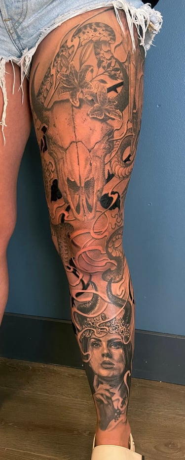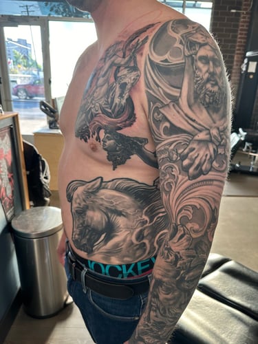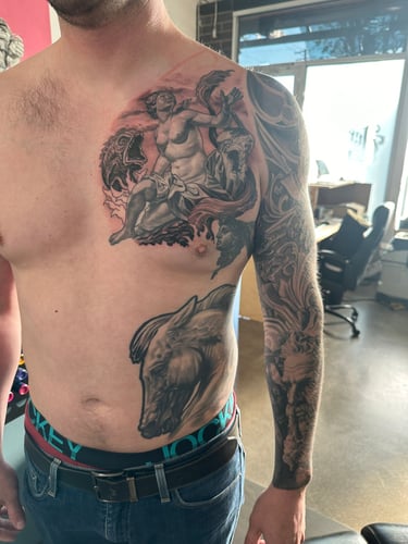 Jake has been tattooing professionally in Portland, OR for over 16 years. He specializes in both black and grey and color realism, portraits, wildlife and landscapes. He also enjoys doing anything dark or horror related, as well as outer space themed imagery. Jake does not close his books and is always open to taking on new clients and discussing your tattoo ideas! click the link to the right to submit an inquiry with Jake